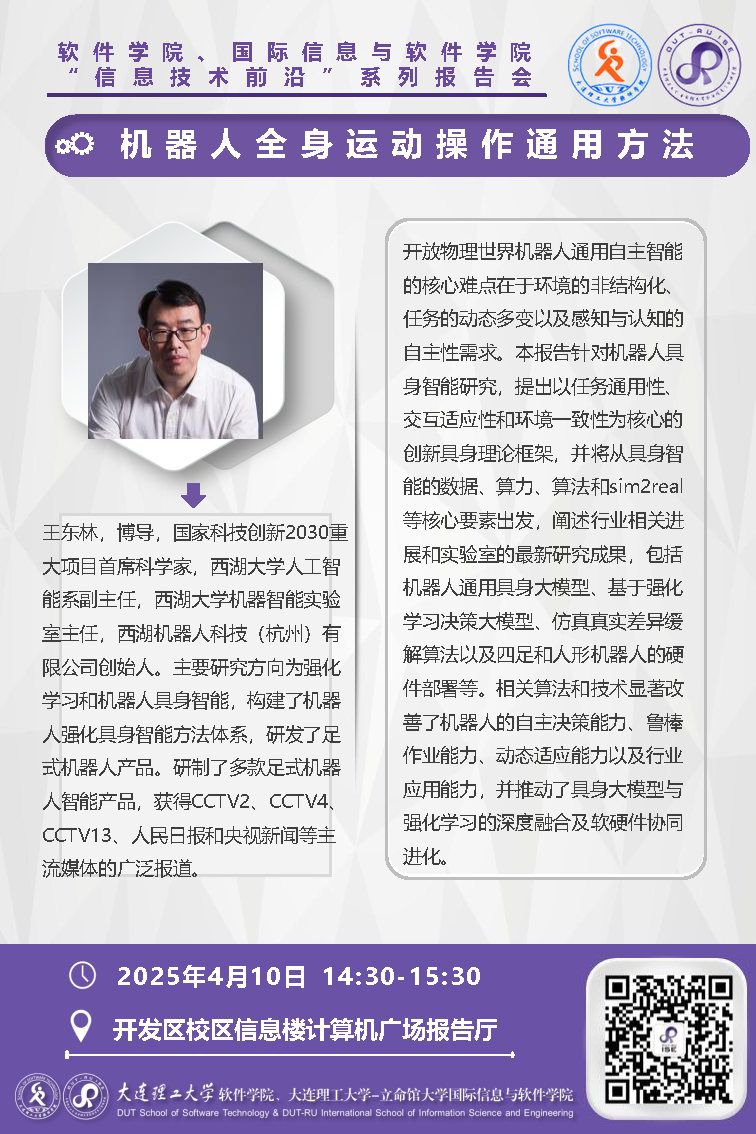 王东林,博导,国家科技创新2030重大项目首席科学家,西湖大学人工智能系副主任,西湖大学机器智能实验室主任,西湖机器人科技(杭州)有限公司创始人。主要研究方向为强化学习和机器人具身智能,构建了机器人强化具身智能方法体系,研发了足式机器人产品。研制了多款足式机器人智能产品,获得CCTV2、 CCTV4、CCTV13、人民日报和央视新闻等主流媒体的广泛报道。