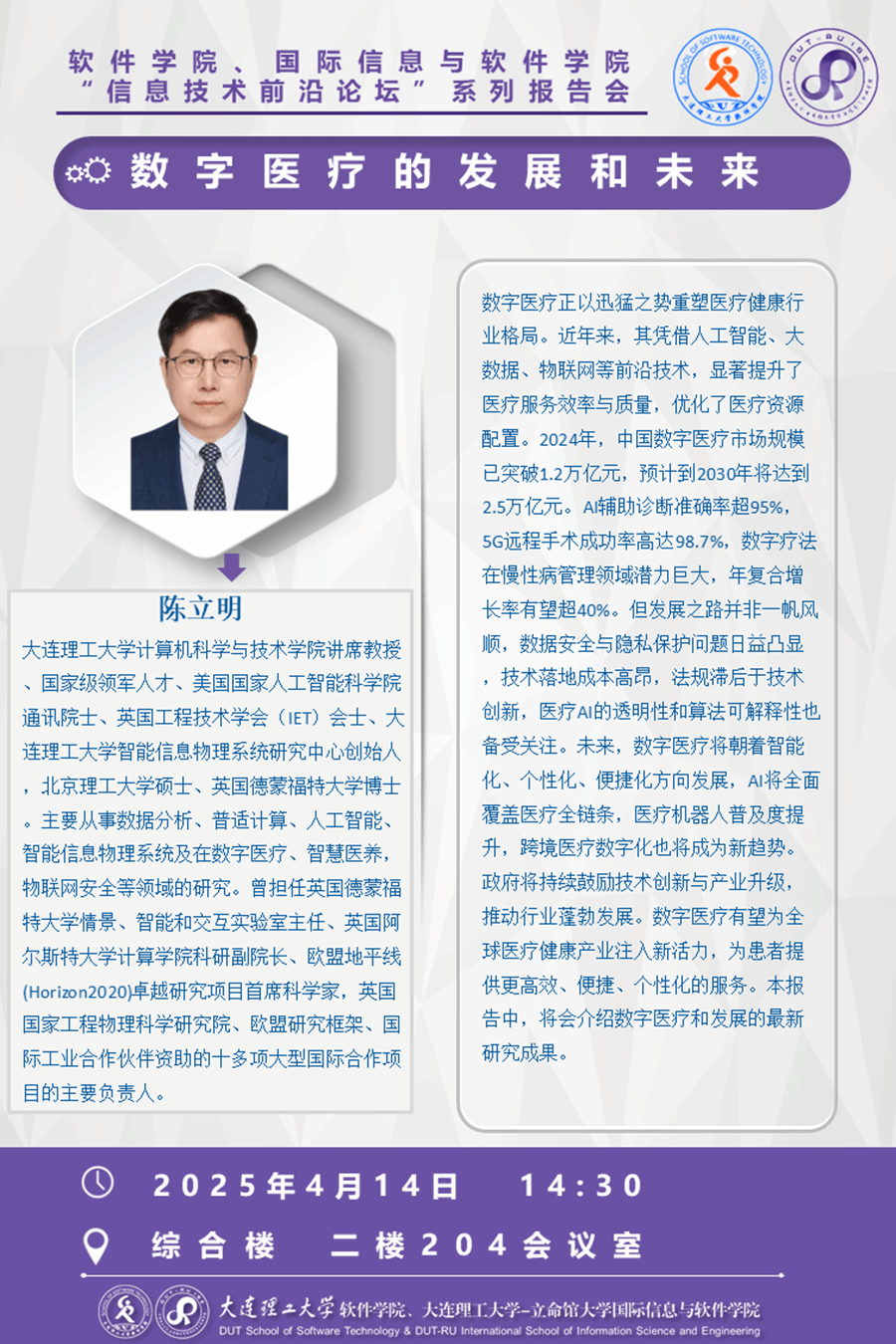 陈立明,大连理工大学计算机科学与技术学院讲席教授、国家级领军人才、美国国家人工智能科学院通讯院士、英国工程技术学会(IET)会士、大连理工大学智能信息物理系统研究中心创始人,北京理工大学硕士、英国德蒙福特大学博士。主要从事数据分析、普适计算、人工智能、智能信息物理系统及在数字医疗、智慧医养,物联网安全等领域的研究。曾担任英国德蒙福特大学情景、智能和交互实验室主任、英国阿尔斯特大学计算学院科研副院长、欧盟地平线(Horizon2020)卓越研究项目首席科学家,英国国家工程物理科学研究院、欧盟研究框架、国际工业合作伙伴资助的十多项大型国际合作项目的主要负责人,英国研究创新基金、欧盟、荷兰、加拿大、丹麦和智利等国家基金项目评审专家。