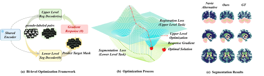该框架在脑影像分割中的应用成果“Bi-level Learning of Task-Specific Decoders for Joint Registration and One-Shot Segmentation”由樊鑫教授、硕士研究生汪小琳、博士研究生高嘉馨、王佳、罗钟铉教授和刘日升教授共同合作完成,被CVPR 2024接收。研究者们常利用空间图像配准来解决单样本医学图像分割,然而这些方法忽略了分割和配准任务特定之间的内在约束,导致训练不稳定效率低下。团队基于LwCL框架,提出了基于双层优化的合作学习训练算法,建模分割与配准任务解码器间的耦合依赖关系。该算法在预训练共享编码器基础上能够高效适应全新数据集,在仅有单个标注情况下,在多个数据集上实现了最好的分割性能,且对于不同的标注不敏感。