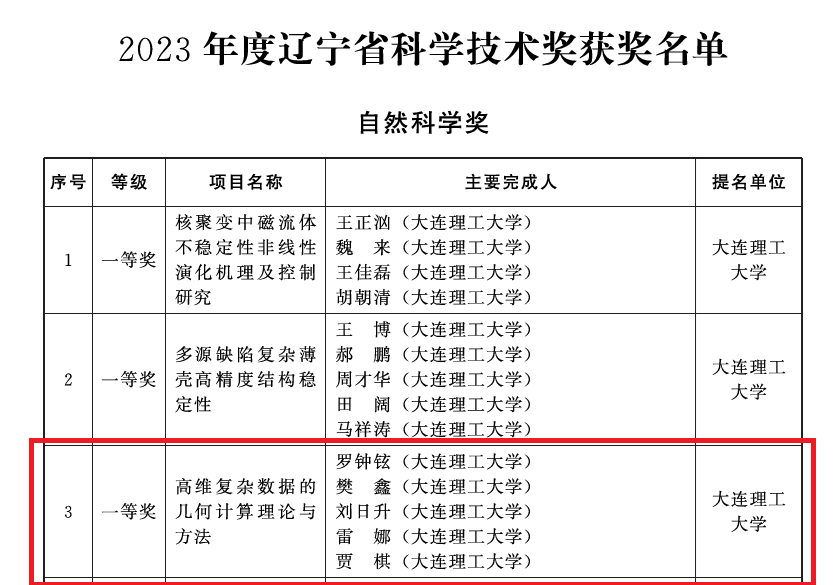 近日,辽宁省人民政府发布了关于2023年度辽宁省科学技术奖励的决定,由我院罗钟铉教授领衔,樊鑫、刘日升、雷娜、贾棋参与完成的“高维复杂数据的几何计算理论与方法”项目荣获辽宁省科学技术奖自然科学奖一等奖。该奖项为我校软件工程学科首次斩获这一殊荣,成为学科发展的又一里程碑。