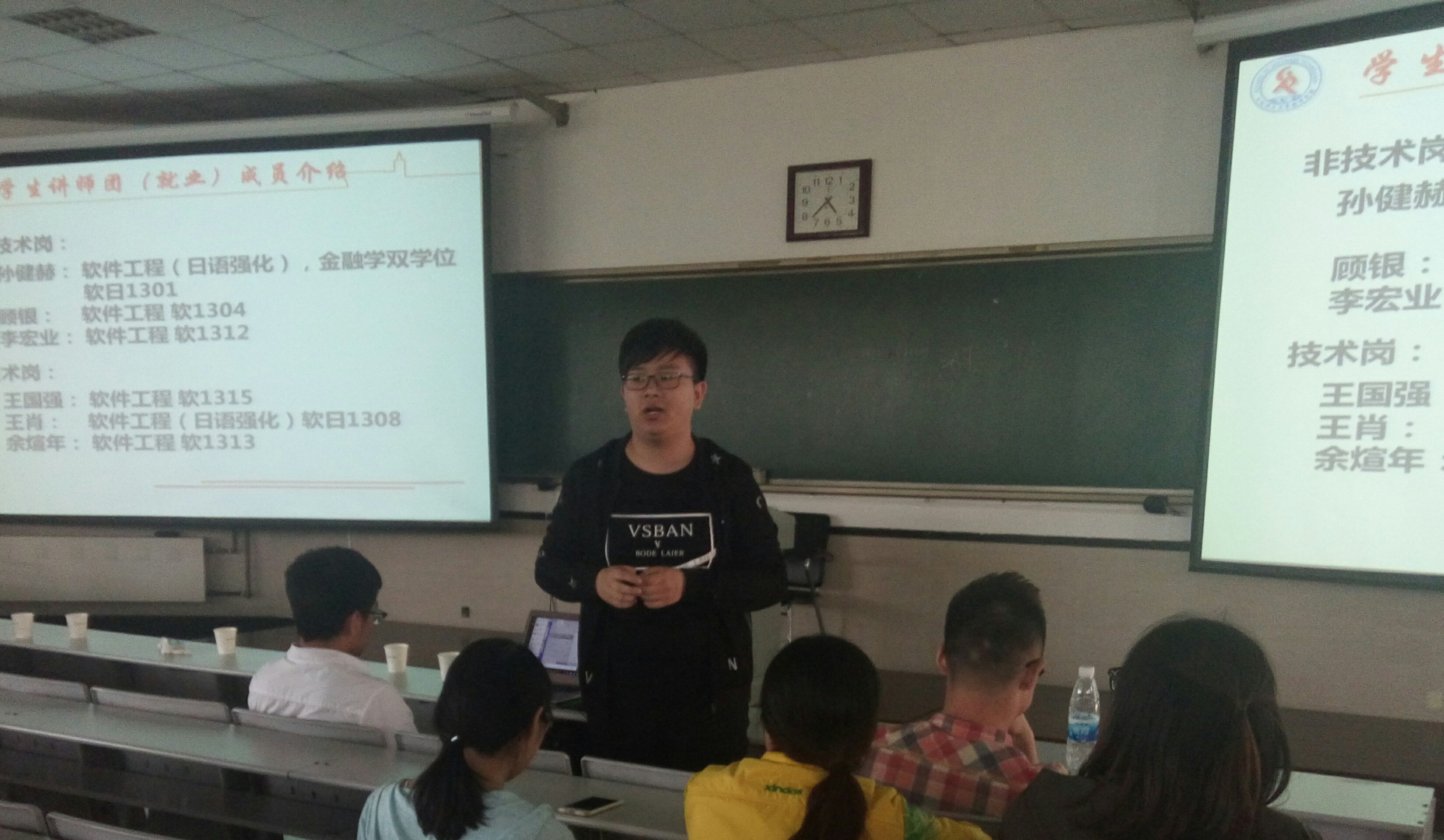 2.顾银(非技术):从自身经历入手,系统地向无求职知识的学弟学妹们传授了几点非技术岗位的技巧与技能:如何填写简历、“厚脸皮”地海投简历寻求机会。并希望大家①开阔视野(订阅号推荐、好书推荐、课堂推荐)②准确定位人生方向。