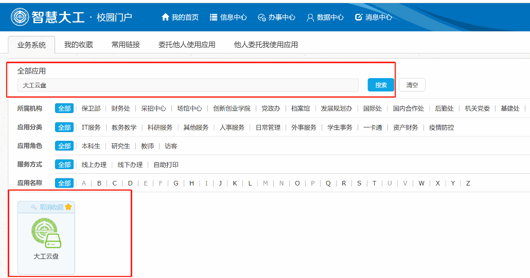 (1)打开校园门户网站,在业务系统搜索“大工云盘”;