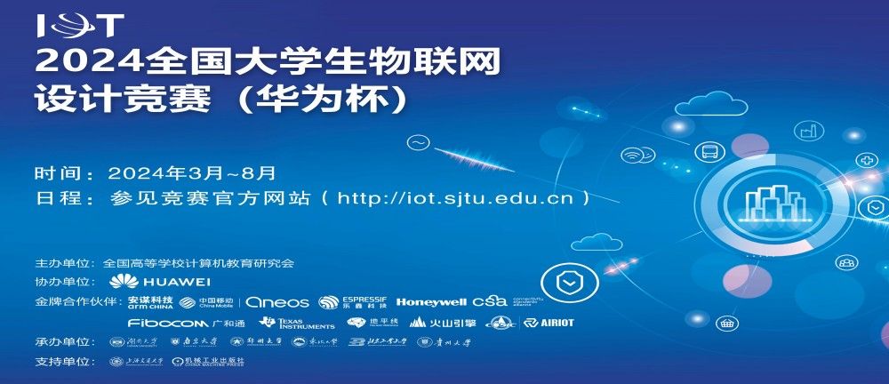 2024年全国大学生物联网设计竞赛由全国高等学校计算机教育研究会主办,华为技术有限公司协办,安谋科技、中国移动&中移物联网、乐鑫信息科技、霍尼韦尔、连接标准联盟(CSA联盟)、广和通、TI、地平线、火山引擎、航天科技等物联网知名企业支持,湖南大学、南京大学、郑州大学、东北大学、北京工业大学、贵州大学、上海交通大学等共同承办,机械工业出版社支持。