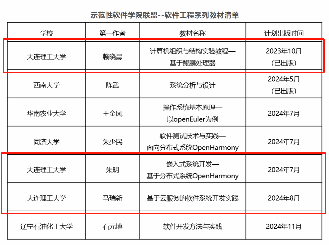 近日,示范性软件学院联盟公布了软件工程系列首批试点应用教材,我院《计算机组织与结构实验教程-基于鲲鹏处理器》《嵌入式系统开发-基于分布式系统OpenHarmony》《基于云服务的软件系统开发实践》三本教材成功入选!此次入选,既是我院推进高校软件工程专业一流课程与教材建设的成果,也是进一步解决我国软件工程专业核心教材缺乏基于自主创新的软件系统的教材体系问题、推动国产自主软件技术和软件工具进课堂、创新产教融合模式、助力特色化软件学院建设、培养高质量软件人才所取得的标志性成果。