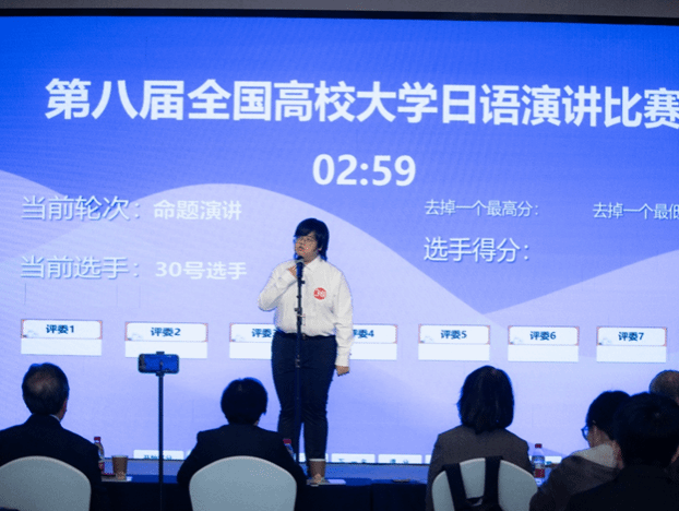本届赛事历时三个月,分初赛和决赛两部分。初赛有65所高校报名参加,经评审,有35个参赛单位进入决赛。决赛分为命题演讲和即兴演讲。命题演讲环节,演讲题目是「AI時代に必要な人間力について」(AI时代所需要的人类力量)。郭斯瀚同学发音标准,表达流畅,演讲内容既有个人经历又有当代年轻人的独特思考,引人入胜,受到评委一致好评。即兴演讲环节抽到的题目是「中国の若者たちの間に流行っていること」(目前流行在中国年轻人之间的事物),郭同学以短视频为主题,从现象切入社会思考,表达逻辑清晰明了,演讲内容富有深度,舞台表现落落大方。最终以命题演讲得分全场第二,即兴演讲得分全场第一,最终总分第一的优异成绩荣获全国特等奖。