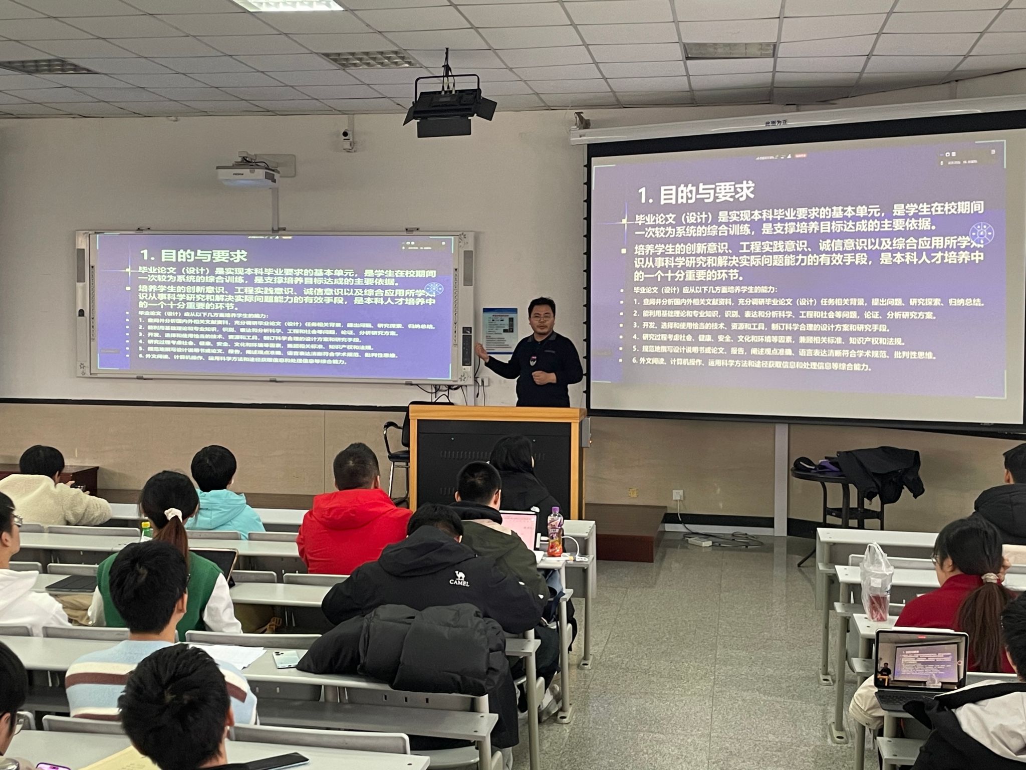 随后,王洁老师按照毕业论文(设计)全流程时间节点,从选题确定、开题答辩、中期检查、修改完善到最终答辩等关键环节,逐一明确了时间要求、任务要点与注意事项。在选题上他特别强调学院积极倡导三大方向:一是鼓励跨学科融合,引导学生探索人工智能、物联网、大数据等前沿技术与大型工业软件、嵌入式软件等特色化领域的深度结合,以培养系统思维与跨界解决复杂工程问题的能力;二是深化校企协同,大力推行“真题实做”模式,引入企业真实研发项目与工程挑战作为选题,使学生在校内导师与企业专家的共同指导下,经历完整的工程实践流程,有效提升就业竞争力与产业适应力;三是聚焦特色软件建设,积极引导对基础软件、工业软件及新兴平台软件感兴趣的同学,投身相关领域的核心技术探索,开展具有自主性与创新性的系统开发或理论研究。此外,对于往届工作中出现的常见问题还进行了针对性提醒,强调学生要严格遵守学术规范、杜绝学术不端,确保2026届本科毕业论文(设计)工作按计划、高质量、有序推进。