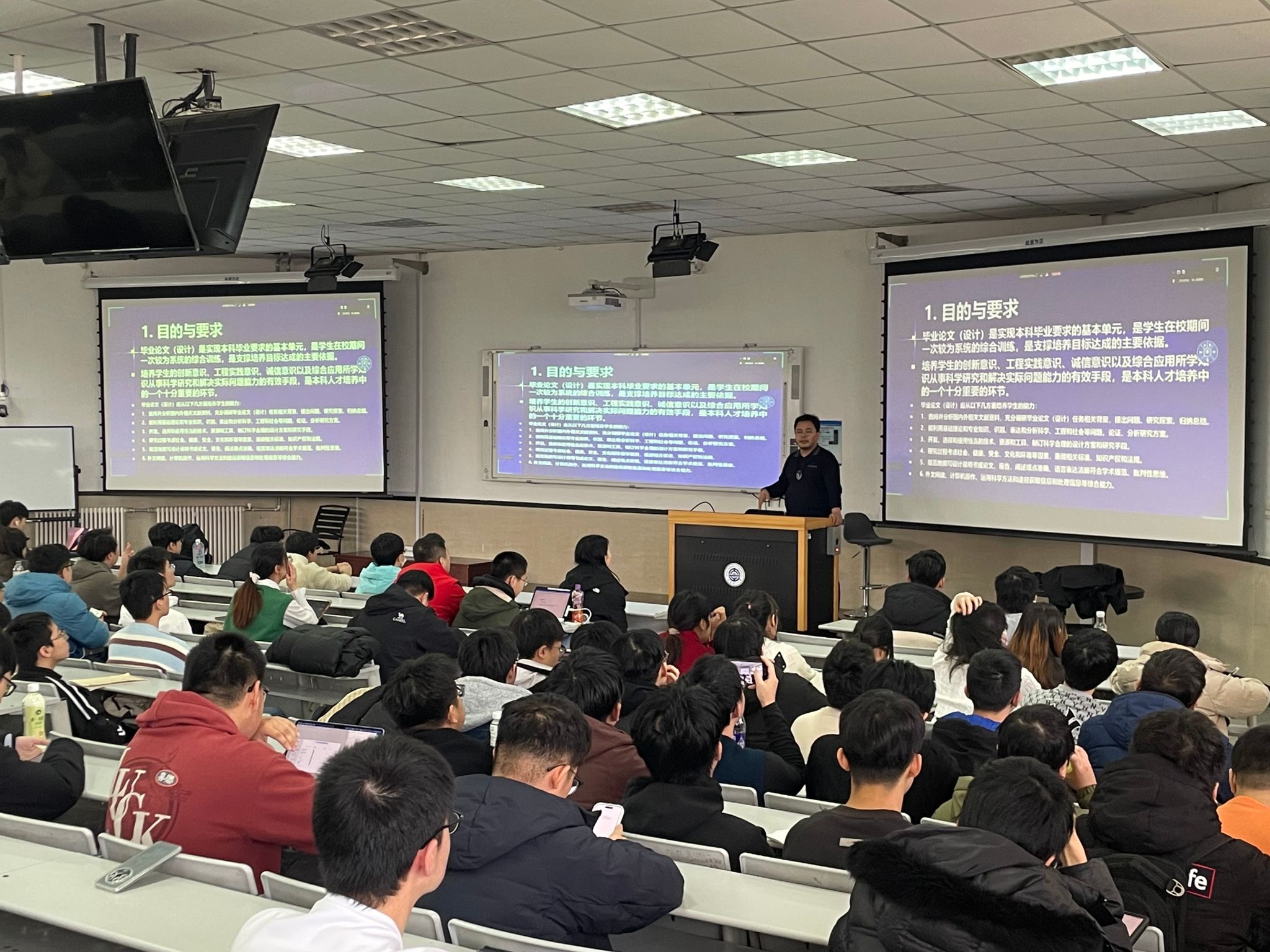为全面部署我院2026届本科毕业设计(论文)工作,明确任务要求、规范流程标准,同时深化创新实践育人成效,保障本科教学质量稳步提升,2025年12月16日,本科教学管理办公室在教学楼C-101组织召开2026届本科毕业论文(设计)动员会。本次动员会由院长助理王洁老师主持,学院2026届全体本科生及教务老师参加大会。
