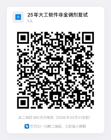 2.请报名考生及时到调剂系统查看,学院预计4月9日8点后向考生发送复试通知,考生必须于接到复试通知4小时内接受,并请按要求参加调剂复试,每名调剂考生只能接收本学院内的一个调剂复试通知。参加调剂复试的考生请于4月9日13点前加入钉钉群(群号:123205001770,二维码见下图),申请进群时需实名备注,审核后方可入群,没有备注不予通过。