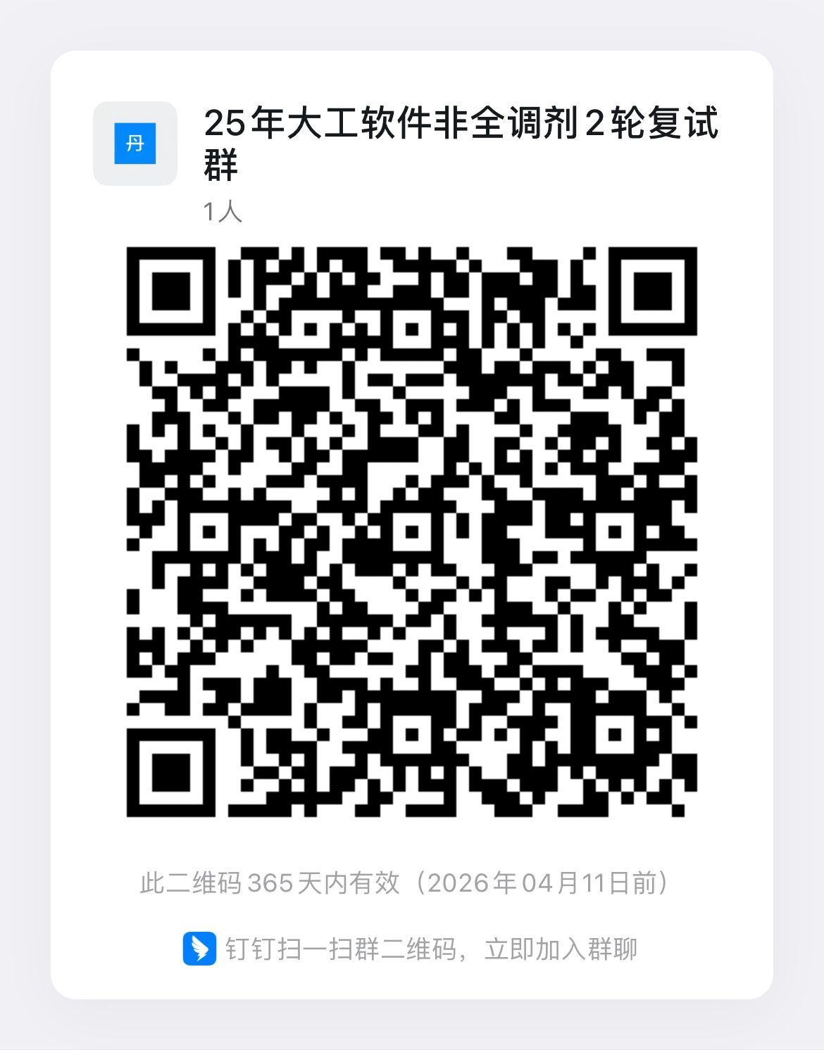2.请报名考生及时到调剂系统查看,学院预计4月14日10点后向考生发送复试通知,考生必须于接到复试通知4小时内接受,并请按要求参加调剂复试,每名调剂考生只能接收本学院内的一个调剂复试通知。参加调剂复试的考生请于4月14日14点前加入钉钉群(群号:72335037686,二维码见下图),申请进群时需实名备注,审核后方可入群,没有备注不予通过。