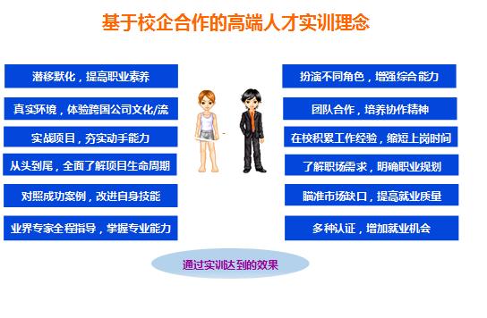 基地秉承“为学生提供人本增值服务”的教育理念,在全球范围内整合IBM、微软、瑞萨、用友等国际知名TI企业合作伙伴的IT教育资源,采用公司化的管理模式,依托大连理工大学的人才、师资优势,引进IBM,微软等国际知名企业的管理模式和教学案例,使学生真切体验企业文化氛围和工作环境,感受公司对员工知识结构、技术能力、团队合作的要求,同时也能从企业文化、业务理解、需求分析、设计编码、产品监控、测试验收等全面熟悉软件开发流程,掌握一个成熟项目的开发规范。完成学员从学生到员工的角色转换,增强学生的就业市场竞争力,为学生提供了一个全方位武装自己的平台。
