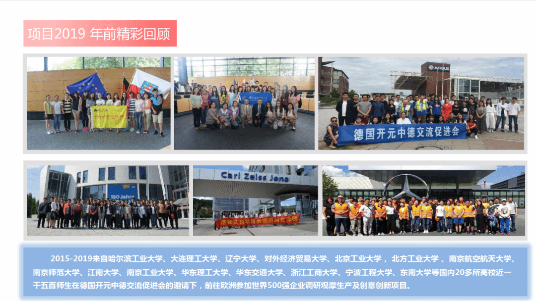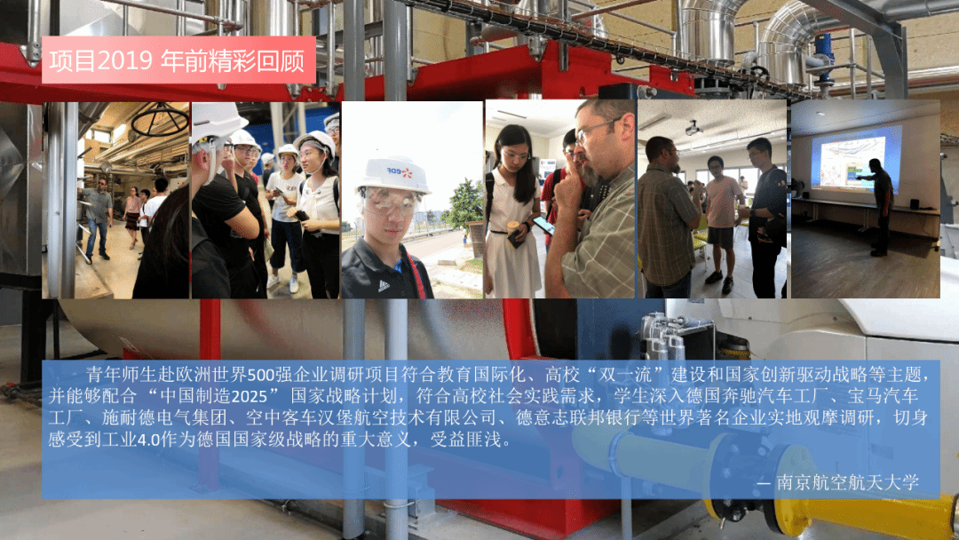 为进一步拓展在校大学生的国际化视野,响应教育部提出的对大学生创意创新要求,并配合 “中国制造2025” 国家战略计划实施,辅助高校培养具有国际视野、了解现代化国际规律的人才,2024暑期在国内高等院校组织优秀大学生赴德国慕尼黑工业大学访学及欧洲世界500强企业实地进行为期20天观摩调研活动。