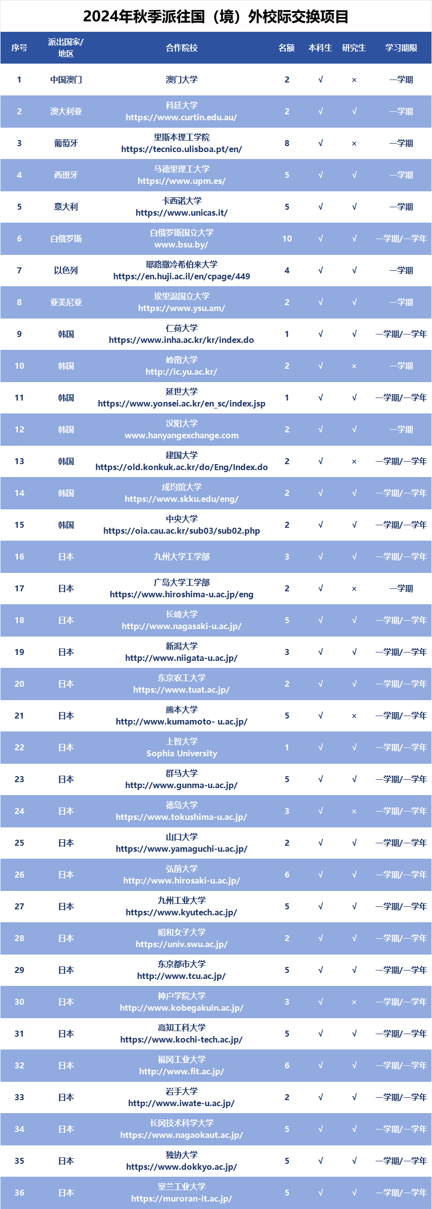 现启动我校2024年秋季赴国(境)外校际交换项目的报名选拔工作。