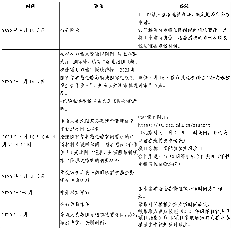 项目具体信息(国际组织实习岗位需求、申请材料及说明和网上报名指南等)以国家留学基金委网站通知为准: