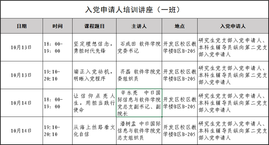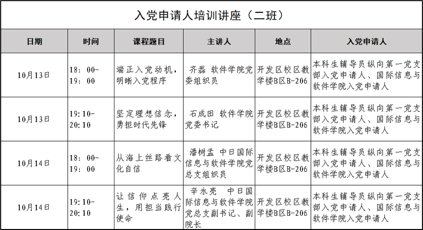 2022年下半年入党申请人培训定于2022年10月13日开班,培训学时为8学时,现将专题讲座时间通知如下:
