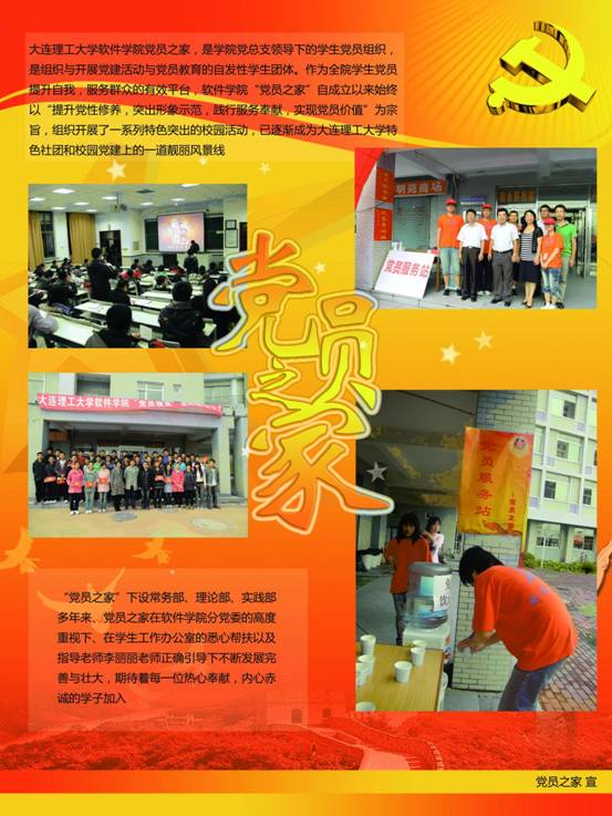 “党员之家”是连接学院党委与学生基层的学生社团,成立7年来,以“全心全意为同学服务”为基准,始终以“提升党性修养,突出形象示范,践行服务奉献,实现党员价值”为宗旨,以践行青春使命为己任。在理论学习、形象示范、志愿服务和素质提升方面引领着当代大学生,是组织与开展党建活动与党员教育的自发性学生团体。!迎新的行李托运、车辆调度,他们用辛勤的汗水诠释奉献精神;理论学习,畅谈十八大时,他们用思维的碰撞诠释担当精神;公益服务、义务奉献时,他们用爱与信念诠释责任精神。他们把自己的青春奉献给了学院每一个明媚的早晨,他们把自己的汗水挥洒到了同学们经过的每一个角落,他们把党的温暖传递给了每一个软件人,他们自信,他们自豪,他们乐于奉献,他们青春无畏,他们将会带着诗一般的笑脸,书写着软件学院更加璀璨的明天。