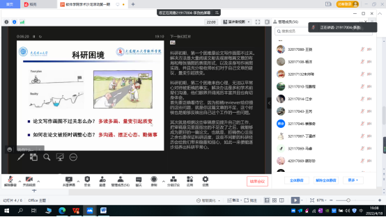 李孜同学主要针对硕士期间走过的一些“科研困境”做经验总结和反思,并详细的为大家讲解科研过程中遇到问题的解决方法。本次学术沙龙活动主要包括以下三个方面:1.克服科研中的困境;2.科研创新研究过程的建议;3.开题中期答辩的注意事项。李孜同学谈到科研初期遇到论文写作画图不过关的问题,就需要大量阅读文献去观察每篇文章的布局和每张插图的表现形式,以及亲身实践,从而量变引起质变。其次科研过程中自己的心态很重要,要以平常心对待被拒稿的事实,拒稿提到的问题,就是这篇文章的不足,拒稿伤心沮丧之余也要保证科研进度,这些不间断的科研经历会给我们带来稳重和信心。此外她还提到要找到有意义的研究问题,找到问题的“高价值动机“,做好背景调研,分析清楚问题的可行性和优势。最后她谈到开题和中期答辩时PPT中内容和形式的注意点,包括每页文字、图和符号的逻辑关系,演讲时间以及图文比例等。 活动最后同学们和李孜同学亲切交流,她为同学们耐心答疑,一一解惑,大家都受益匪浅。