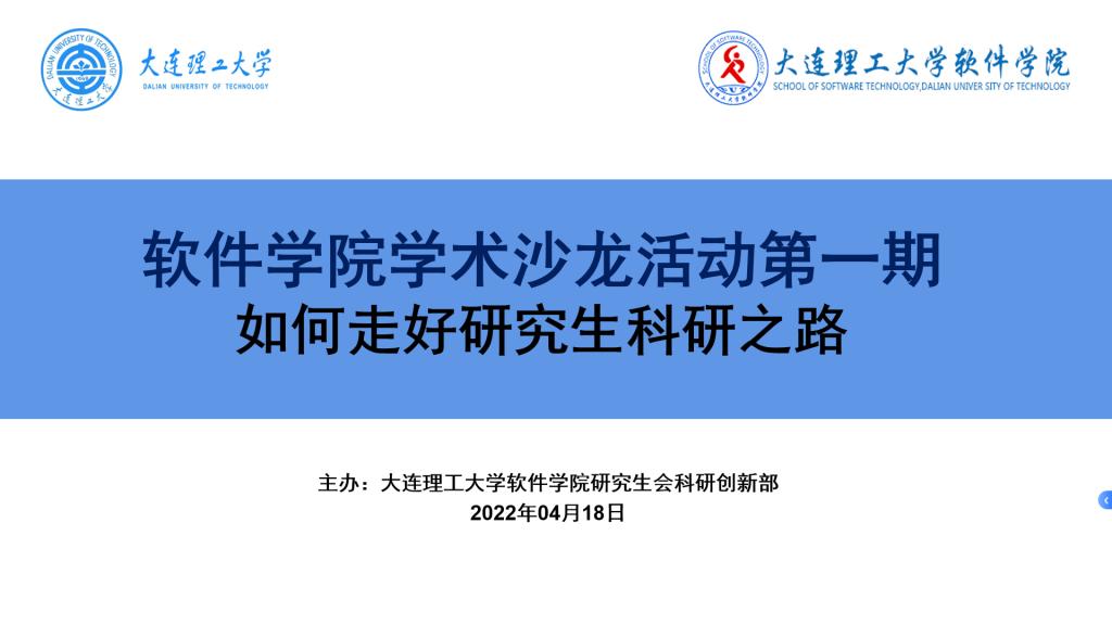 随着课程的结束,考试的临近,有部分研一研二的同学在研究生生活、科研中出现了迷茫,对于即将到来的开题和答辩充满了焦虑。为此软件学院研究生会科研创新部于4月18日晚七点组织开展了本学期第一期学术沙龙活动。此次活动主要以分享科研创新和开题答辩两方面的相关经验为主要内容,进而引出如何走好研究生科研之路的主题,旨在为大家提供一个解决问题的方法,一个思考问题的方向,一条奋勇前进的科研创新的学习之路。