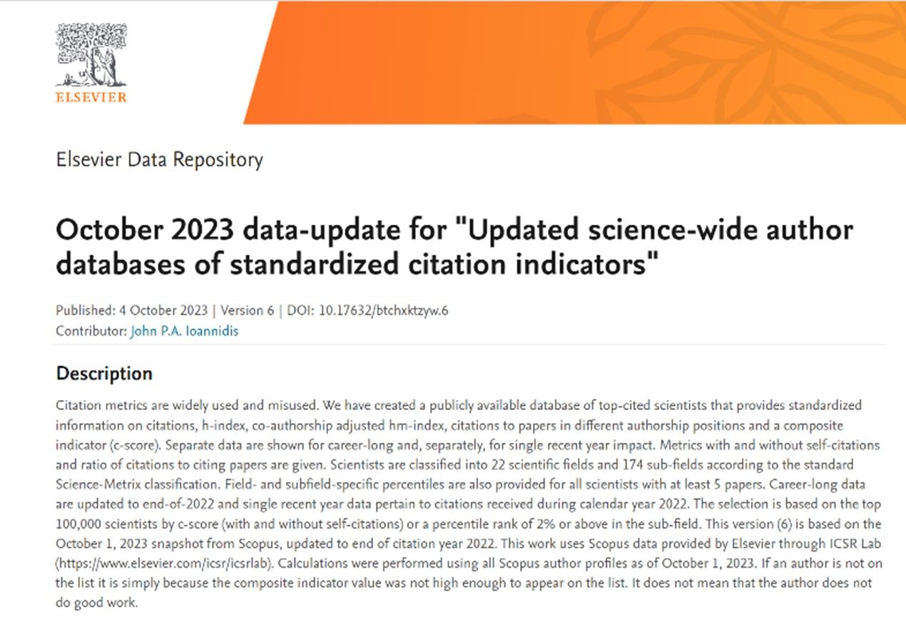 近日,美国斯坦福大学与爱思唯尔数据库(Elsevier)发布了第六版“2023全球前2%顶尖科学家榜单”,分为“终身科学影响力排行榜”(反映科学家职业生涯期间的综合影响力表现)和“年度科学影响力排行榜”( 反映科学家上一年度的学术影响力)两个榜单,分别对应1960~2022年及2022年度两个时间区间综合数据。