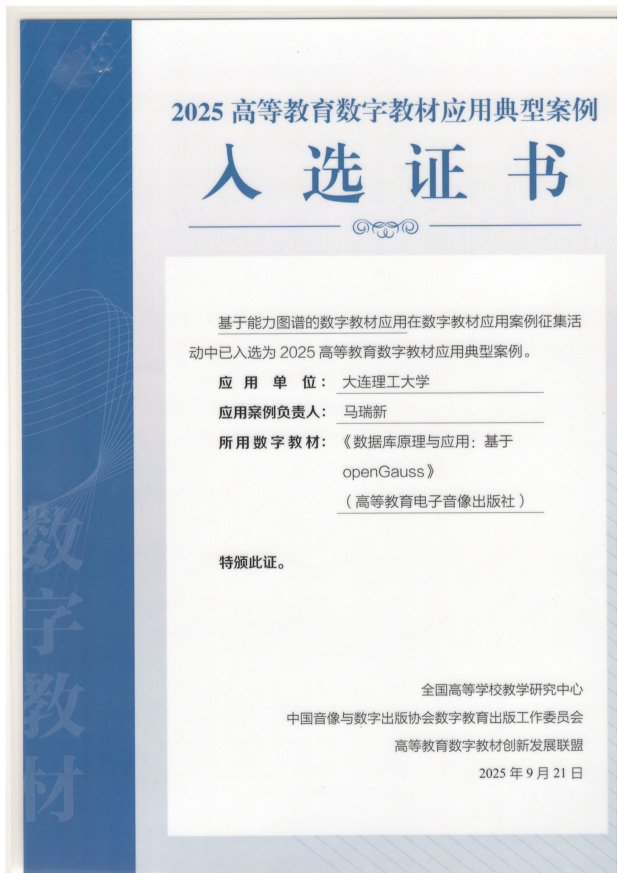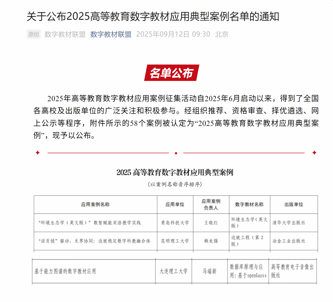 近日,高等教育数字教材创新发展联盟公布了“2025高等教育数字教材应用典型案例”名单。我院马瑞新教授申报的《基于能力图谱的数字教材应用》在数字教材应用案例征集活动中已入选为 2025 高等教育数字教材应用典型案例。