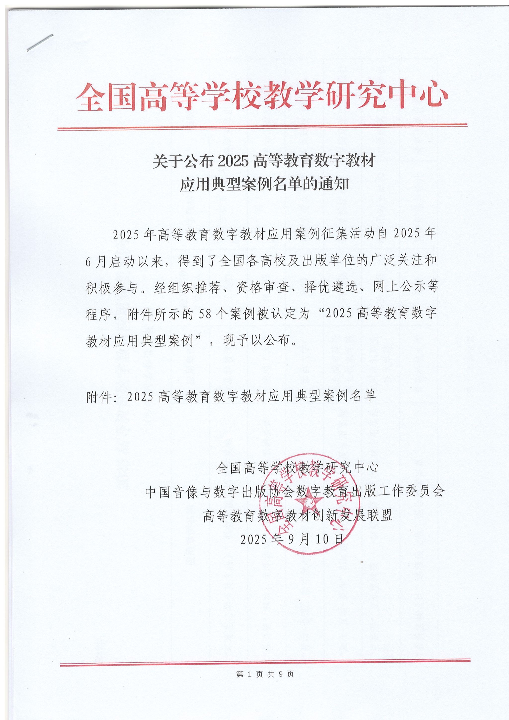此次案例征集活动由全国高等学校教学研究中心、中国音像与数字出版协会数字教育出版工作委员会、高等教育数字教材创新发展联盟联合主办,为深入贯彻《教育强国建设规划纲要(2024—2035年)》关于“实施国家教育数字化战略”的部署,响应教育部2025年初出台的《教育部等九部门关于加快推进教育数字化的意见》,以数字教材为突破口,旨在推动教育出版深度融合发展,深化数字教材在教育教学中的创新应用,总结推广优秀实践经验。最终全国仅58项案例脱颖而出(我校第一次入选)。
