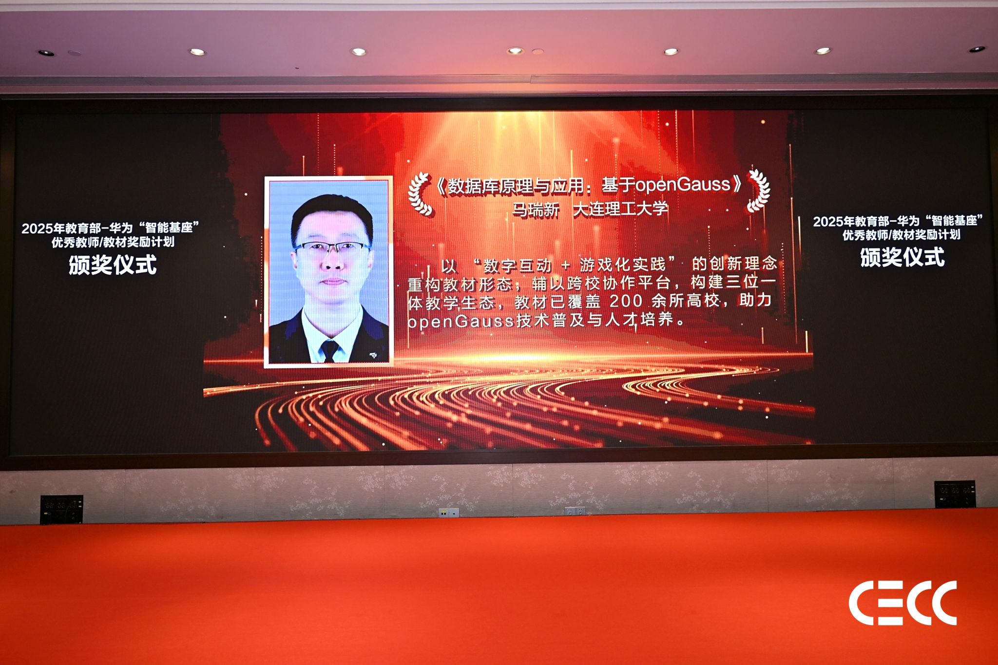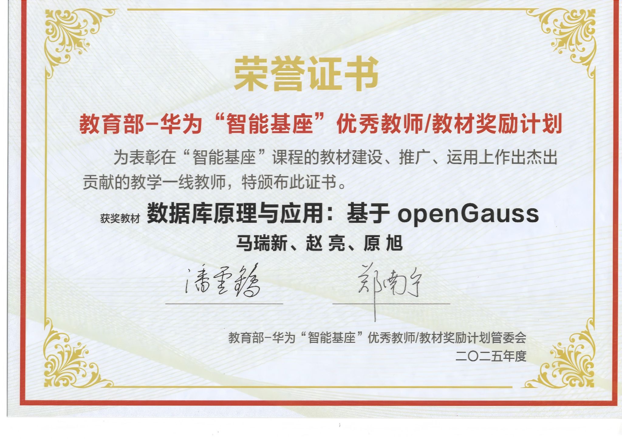 近日,以“新智能·新范式·新时代”为主题的第七届中国计算机教育大会(CECC)在厦门召开,会议公布了2025年度教育部-华为“智能基座”优秀教材奖励计划获奖名单。在此次评选中,我院马瑞新教授主编的《数据库原理与应用:基于openGauss》教材荣获2025年度 “智能基座”优秀教材,全国仅六部教材获奖。