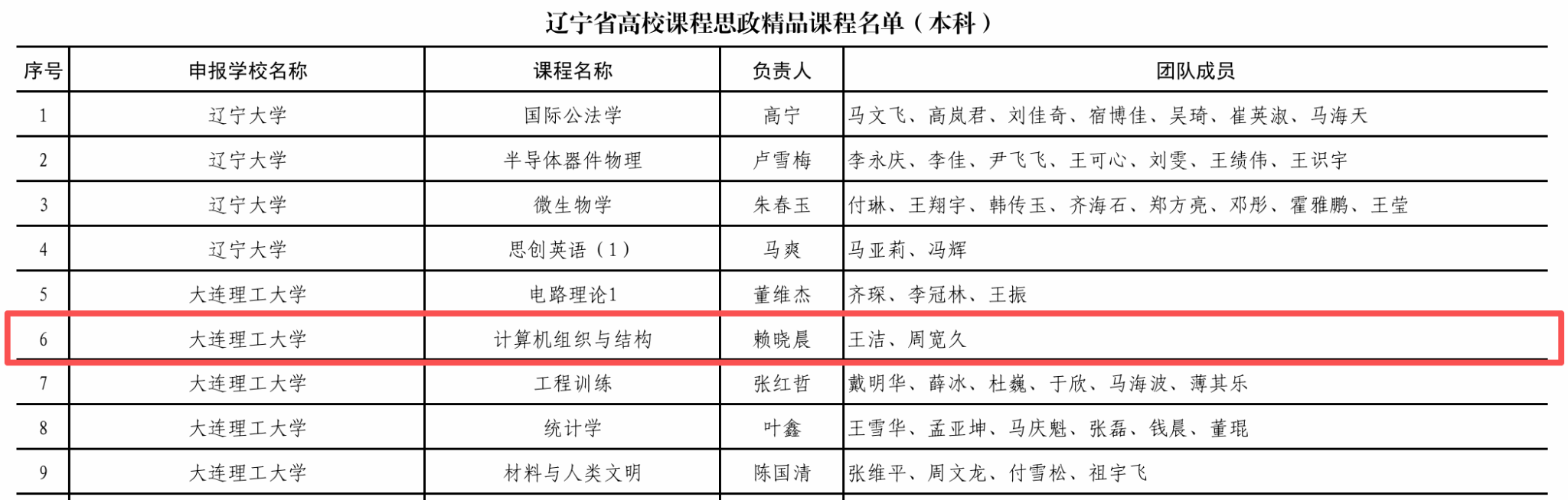 近日,辽宁省教育厅公布了2025年辽宁省高校课程思政精品课程遴选入选名单,我院赖晓晨教授课程团队的《计算机组织与结构》课程凭借鲜明的思政特色、扎实的教学功底和突出的育人成效,成功入选。这项成果既是该门课程团队长期以来在该领域深耕厚植的成果体现,也标志着学院在推进课程育人、融合价值引领与知识传授方面取得了重要进展。此项突破将为学院全面落实立德树人根本任务提供有力支撑,进一步激发教育教学改革的深层活力。