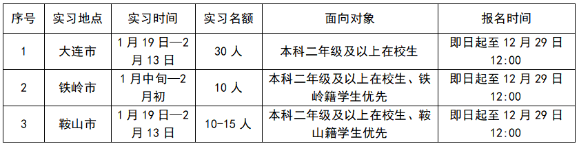 2026年寒假学校计划开设大连市、鞍山市、铁岭市3个寒假政务实习基地,具体要求等更多信息详见附件,基地情况见下表: