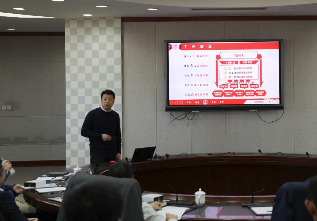 最后,院长吴国伟以“高质量发展和特色化发展”为主线,全面介绍了2021年度学院在学科建设、校企合作、人才培养等方面取得的重要进展。2021年软件学院获批教育部首批特色化示范性软件学院、软件工程学科在软科“中国最好学科排名”中由第7位跃升至第4位等。吴国伟对新一年的工作进行了展望,明确了目标,希望在特色化示范性软件学院建设工作中,全体教职工携手同心,在启动学院建设新任务、开展办学条件新基建、建设师资队伍新体系、推进产教融合新模式等工作中继续取得更多、更好的成绩。