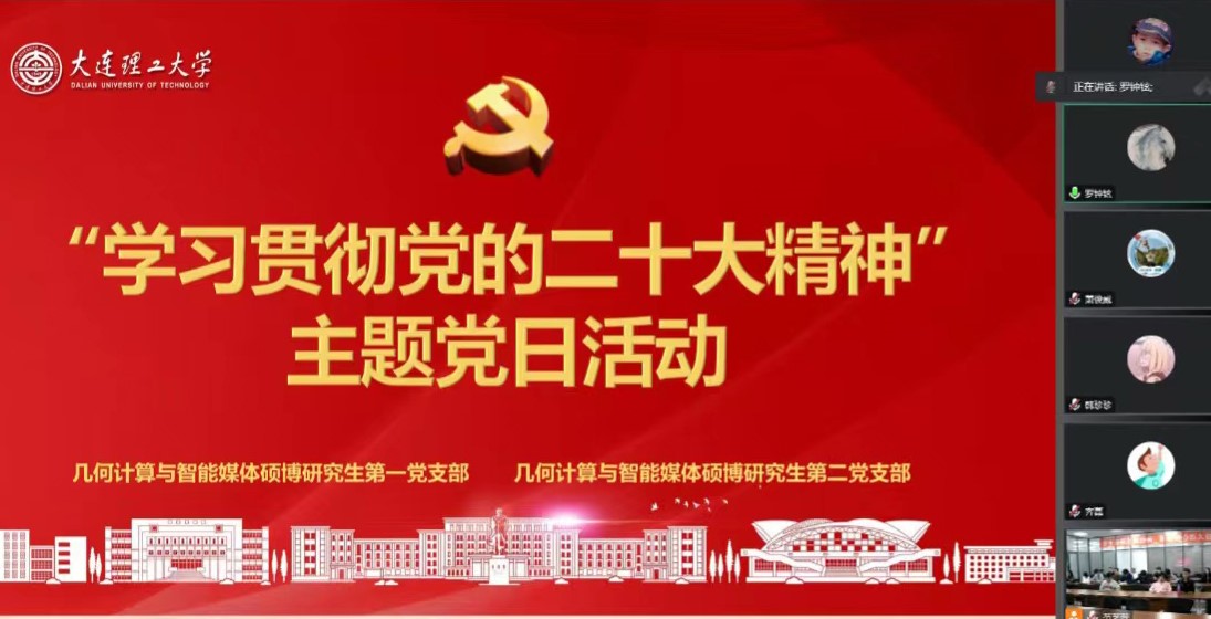 为深入学习宣传贯彻党的二十大精神,全面理解和把握党的二十大报告的丰富内涵,12月6日晚,软件学院几何计算与智能媒体硕博研究生第一、第二党支部联合开展“学习贯彻党的二十大精神”主题党日活动。主题党日活动采用线上线下相结合的方式进行,党支部联系领导校党委常委、副校长罗钟铉,软件学院纪委书记、副院长王雷,党委副书记兼副院长王雷参加了会议,会议由党支部书记范艺蕊主持。