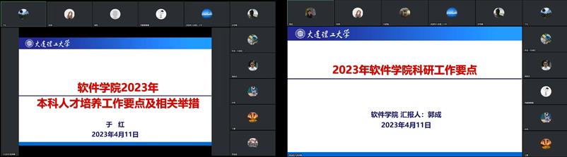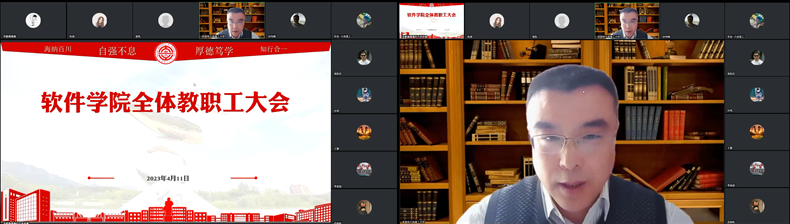 近日学院制定并印发了《软件学院2023年工作要点》,为进一步明确各项工作任务,凝心聚力推动学院的高质量发展,4月11日,软件学院在线召开全体教职工大会。学院全体教职工参加了此次会议,会议由院长吴国伟主持。