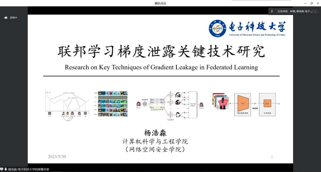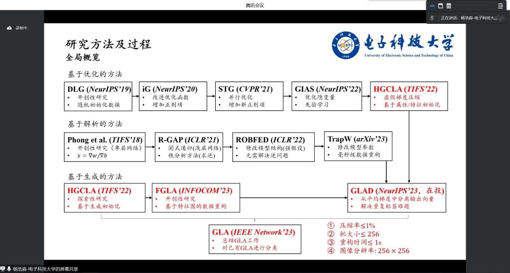 接着,电子科技大学杨浩淼教授带来题为“联邦学习的梯度泄露关键技术研究”的报告,介绍了联邦学习中的梯度泄露攻击,详细介绍了目前先进的梯度泄露攻击方法,包括优化方法和分析方法,这些方法对于改进梯度泄露攻击的检测和防御方法具有重要意义。最后,本报告提出了未来的研究方向和挑战,以进一步加强联邦学习中的梯度泄露攻击的检测和防御。