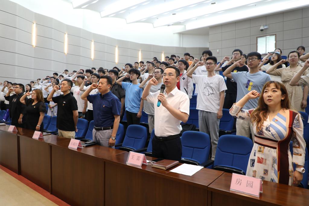 接下来,石成田为毕业生党员代表颁发了纪念品。学院党委副书记兼副院长王雷为毕业生班级联络人代表颁发了聘书。活动最后,全体党员起立,共同重温入党誓词。