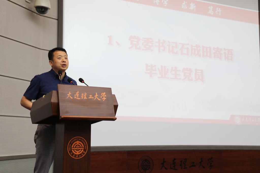 石成田寄语毕业生党员,他指出,新时代的大学生党员肩负着民族复兴的重任,必须牢记使命,矢志奋斗。他对毕业生党员提出了四点期望,第一,要有家国情怀,做胸怀祖国,以民族振兴,国家强盛为己任的新时代青年。第二,要甘于奉献,充分发挥党员的先锋模范作用,尽一份力,发一份光,散一份热,以身作则营造良好的社会风尚;第三,要不断超越自我,不能停下学习和进步的脚步,充分完善自我立足岗位作出成绩;第四,要学会感恩,既要感恩国家和学校的培养,更好感恩成长路上的种种经历。