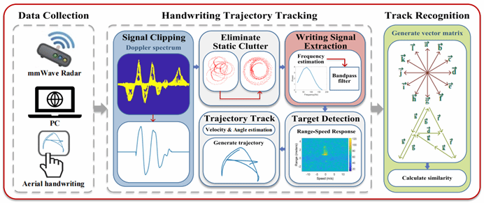 该成果由林驰副教授、孙周鹤(2021级硕士研究生)、Asfandeyar Ahmad(2021级博士研究生)、范鑫鑫副教授(中科院)、王祎副教授、王雷教授、樊鑫教授、吴国伟教授共同完成。这篇论文设计了一个名为AirWrite的创新系统,旨在解决空中手写轨迹跟踪和识别的问题。AirWrite利用77 GHz毫米波雷达技术,通过先进的信号处理和分析技术,实现了高精度的非接触式手写识别。该系统提出了一种基于多普勒效应的信号裁剪方法,能够有效地在时域中剔除非手写动作信号,提高了轨迹跟踪的准确性。此外,该系统通过分析信号频率范围内的功率变化,开发了一种提取手写信号的方法。这种方法能够识别手写频率,并有效地消除动态环境中的噪音。该系统还设计了一个轨迹跟踪模型,能够在各种条件下(如不同距离、角度、书写速度和字符大小)准确跟踪空中手写轨迹,即使在有障碍物和行人移动的环境中也能保持高精度。最后,该系统提出了一种将轨迹曲线转换为向量矩阵的识别方法,使系统能够使用小型数据集(仅34 KB)在0.15秒内实现超过96%的平均识别准确率。