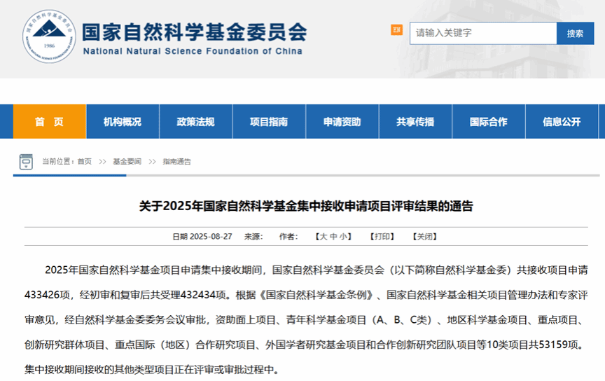 国家自然科学基金委员会公布了2025年度集中接收申请项目的评审结果,我院共获资助项目10项,立项直接经费616万元,包含1项国际(地区)合作与交流项目(重点类)、6项面上项目和3项青年基金项目。