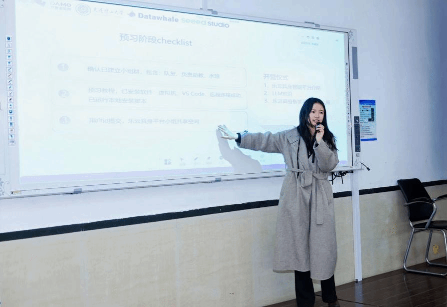 随后,Datawhale高校负责人黄思语对训练营的整体安排进行了详细介绍。她从训练营的课程设计理念入手,详细解读了接下来的学习流程、任务机制以及考核方式。她表示,本次训练营注重“学以致用”,通过阶梯式的任务设置,引导学员逐步深入具身智能的核心领域,鼓励学员在团队协作中碰撞思维火花,共同进步。